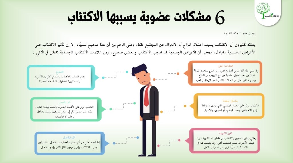 لم يعد محصورًا بالجانب النفسي أو الحالة النفسية العامة للفرد، بل هو مرض يحمل في طياته آثارًا سلبية على صحة المريض عمومًا وربما يحدث بسبب وجود مشكلة صحية ما. هو أكثر من الشعور بحزن شديد، بل الكآبة مرض يؤثر على مختلف الوظائف الحيوية في الجسم فيرفع نسبة التعرض لمرض القلب، ويخل بعمل جهاز المناعة وغيرها الكثير من الأمراض العضوية. وتشير الإحصائيات إلى أن مرض الكآبة يصيب أكثر من 121 مليون شخص حول العالم، ويصاب به 15% -25% من النساء و10% -15 % من الرجال. يحدث الاكتئاب نتيجة نقص أو عدم توازن في المواد الكيميائية الموجودة بالمخ والجسم كافة.